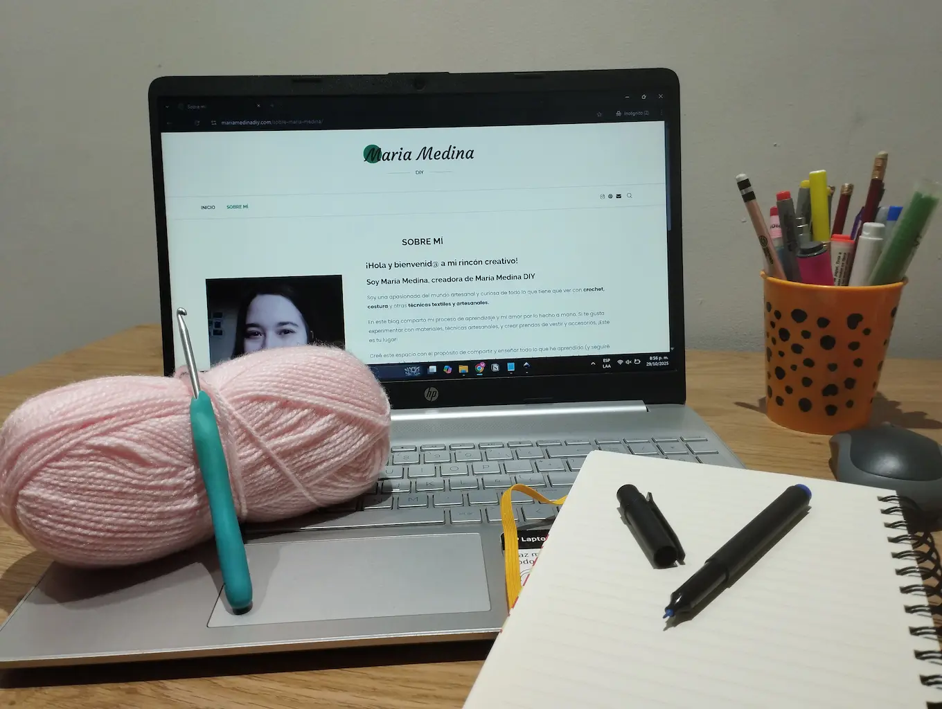 Sobre una mesa de color cafe claro hay un portátil gris en donde se ve el blog Maria Medina DIY. Sobre el portátil hay un ovillo de lana rosado, una aguja de crochet con mango azul, un cuaderno abierto. Sobre el cuaderno hay un bolígrafo destapado. Al lado derecho del portátil hay un mouse y un portalápices